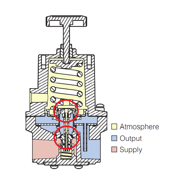 当考虑调节阀“阀座”时,我们所参考的是在调节过程中开启和关闭阀门时与销(阀芯)连接的供应或排气阀座。在大多数减压调节器中,在供应阀和排气阀中都有一个阀座。这些区域在我们的7000型精密的空气调节器。