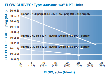 选择输出压力范围时,重要的是要了解正常的输出压力要求。我们的一般经验法则是选择一个弹簧范围,将所需的输出压力置于该范围的50%至80%。例如,如果您需要45 psi输出,则理想的是0至60 psi范围。您可以选择更大的范围(即0至120 psi),但是增加范围也会影响分辨率和下垂。春季范围越高,考虑使用弹簧力平衡机制的调节器时,下垂曲线越陡。如下所示,这是我们330 AFR(空气过滤器调节器)的流动曲线。