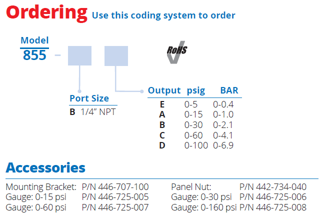 | 输出范围 | 0-5 psig (0-0.4 bar), 0-15 psig (0-1.0 bar), 0-30 psig (0-2.1 bar), 0-60 psig (0-4.1 bar), 0-100 psig (0-6.9 bar) |